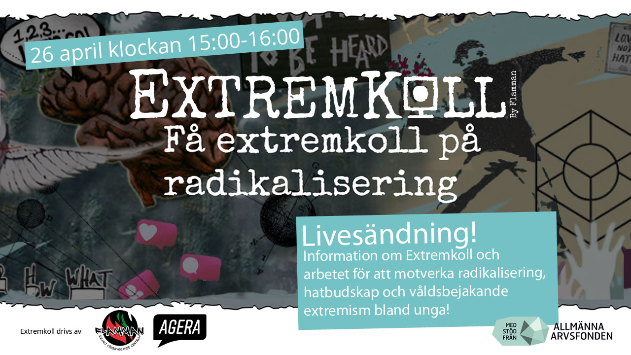 Bakom Extremkoll.se står Flamman Socialt förebyggande centrum (Flamman SFC), en idéburen förening som sedan 1997 arbetar för att skapa bättre förutsättningar och möjligheter för barn och unga. Extremkoll finansieras med stöd från Allmänna Arvsfonden och har tagits fram tillsammans med bland annat Agera Värmland . Flamman SFC har lång erfarenhet av att arbeta både demokratifrämjande och mot våldsbejakande extremism, och vår satsning Extremkoll är ett sätt att sprida vårt förebyggande arbete till fler och på nationell nivå och samtidigt vara en unik kunskapsresurs riktad direkt till ungdomar.